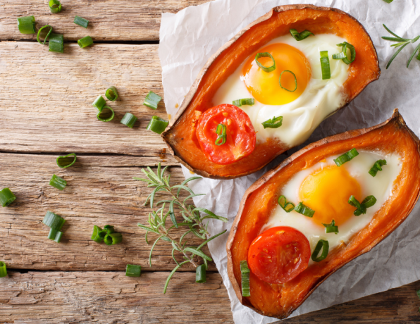 Υλικά: 2 γλυκοπατάτες 4 κ.σ. ελαιόλαδο 50 γρ. τυρί κρέμα 1 κ.σ. θυμάρι 1 φρέσκο κρεμμυδάκι, ψιλοκομμένο 4 Ηπειρώτικα Αυγά ΠΙΝΔΟΣ ντοματίνια φύλλα κόλιανδρου αλάτι πιπέρι Εκτέλεση: Προθερμαίνουμε τον φούρνο…